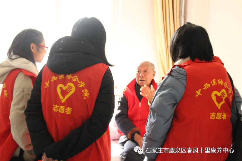 2019年12月7日上午,春風(fēng)十里康養(yǎng)中心迎來了河北中醫(yī)學(xué)院的志愿者同學(xué)前來慰問表演。到來之后志愿者們在其社長、副社長及春風(fēng)十里康養(yǎng)中心工作人員的安排下,有條不紊的分團分組結(jié)伴去老人的屋子里去陪老人聊天、唱歌、唱戲、愉悅的聲音傳遍整個康養(yǎng)中心,使老人的心靈得到寬慰。
