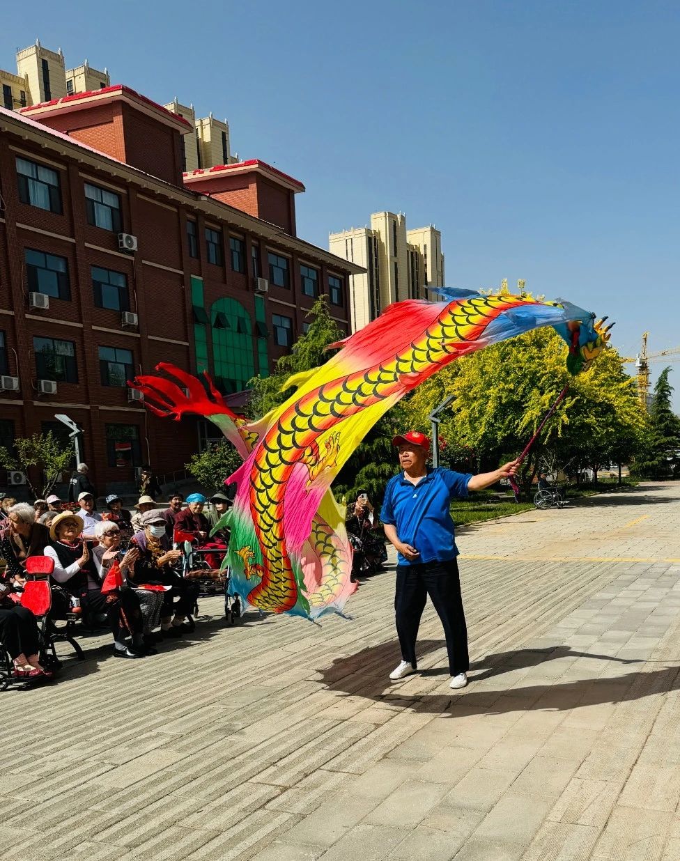 ↓在養(yǎng)老人表演《舞龍》