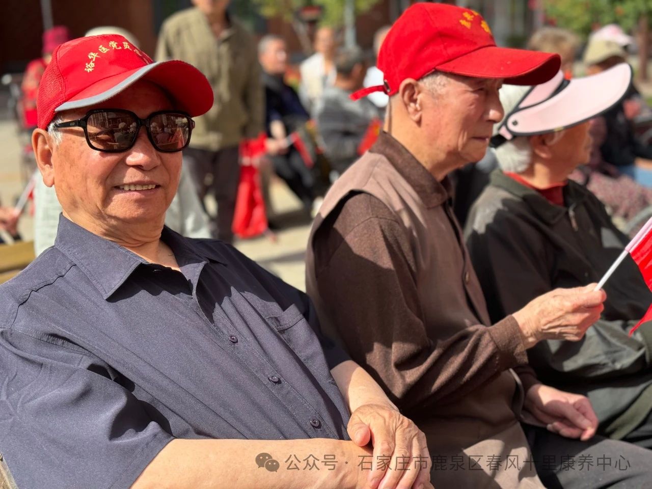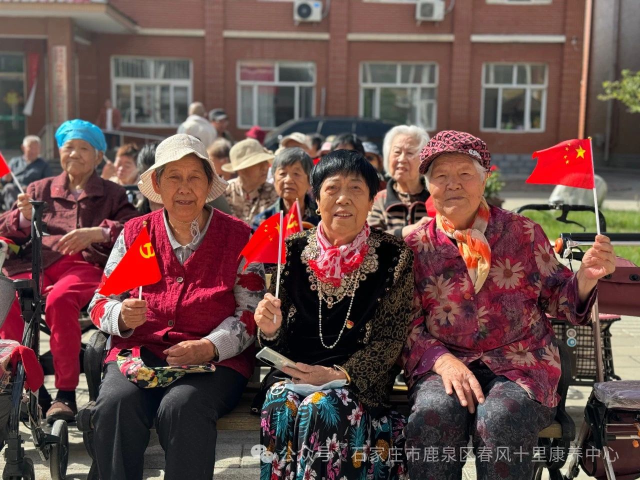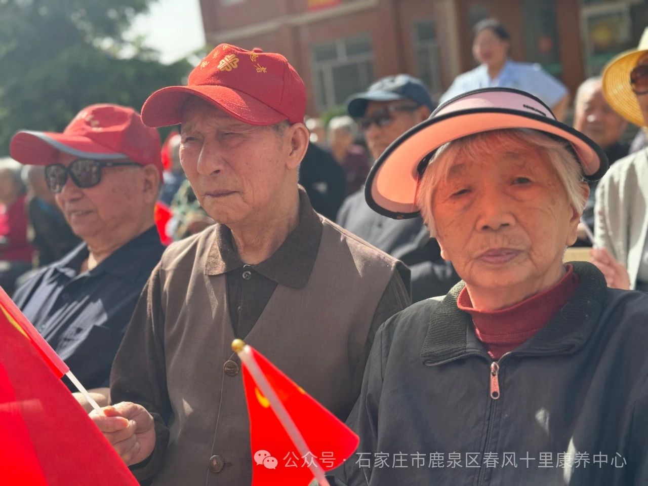 ↓老人們揮動彩旗齊聲高歌《愛的奉獻》